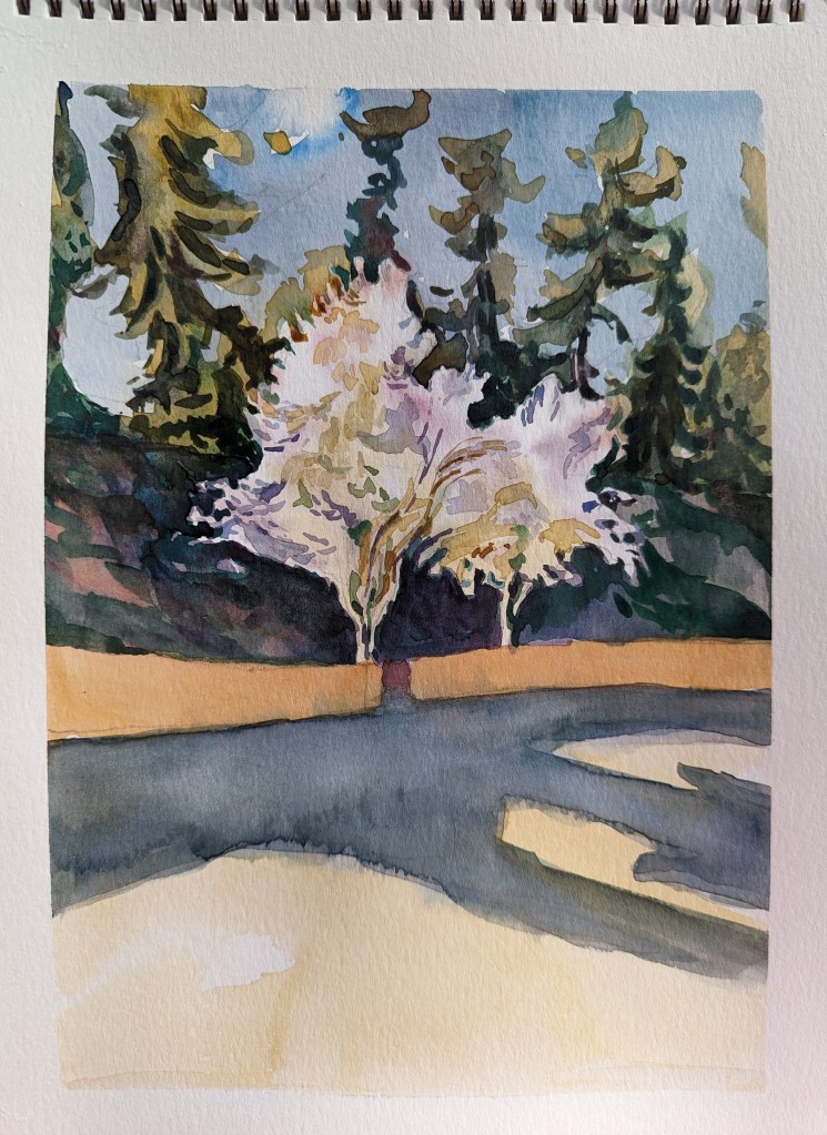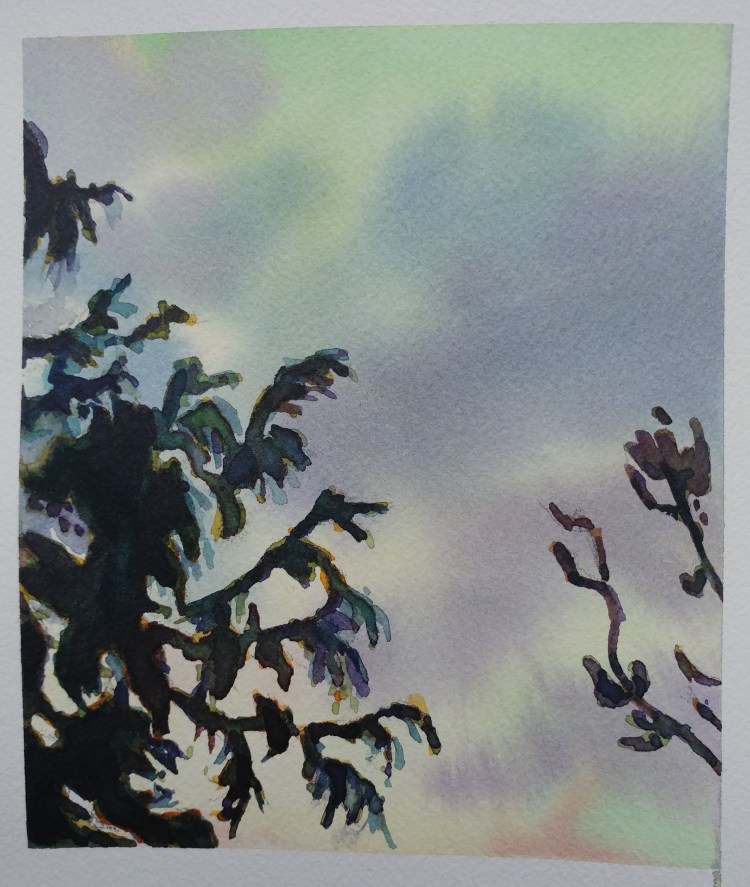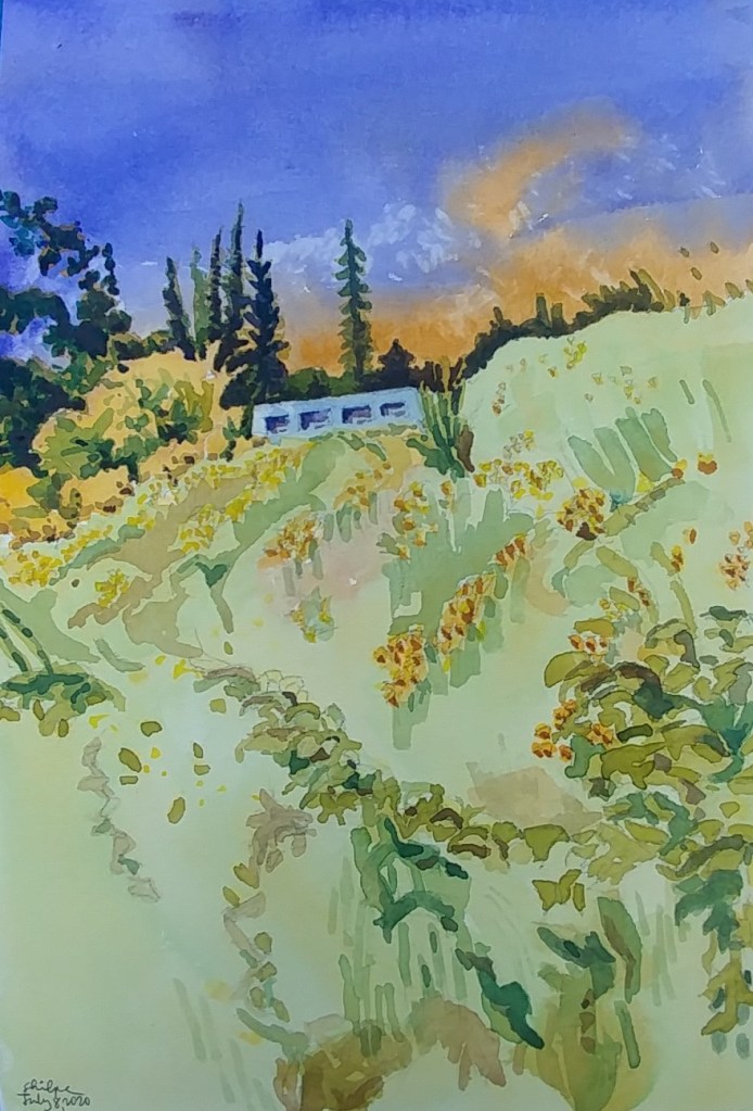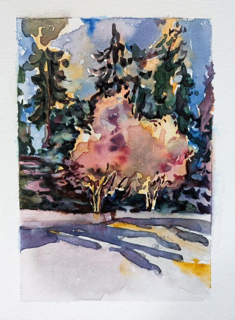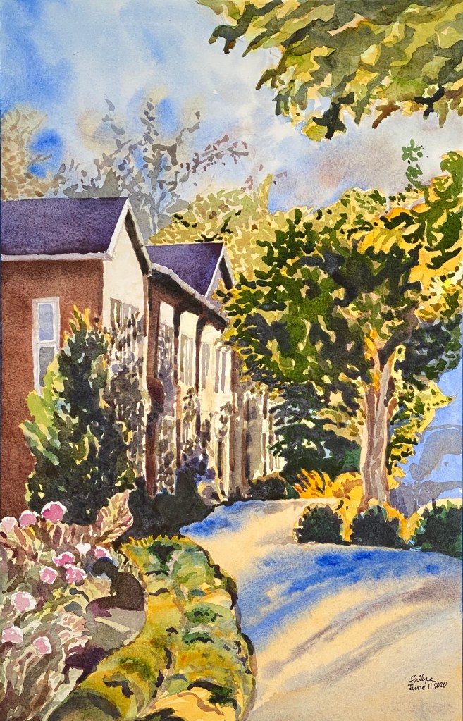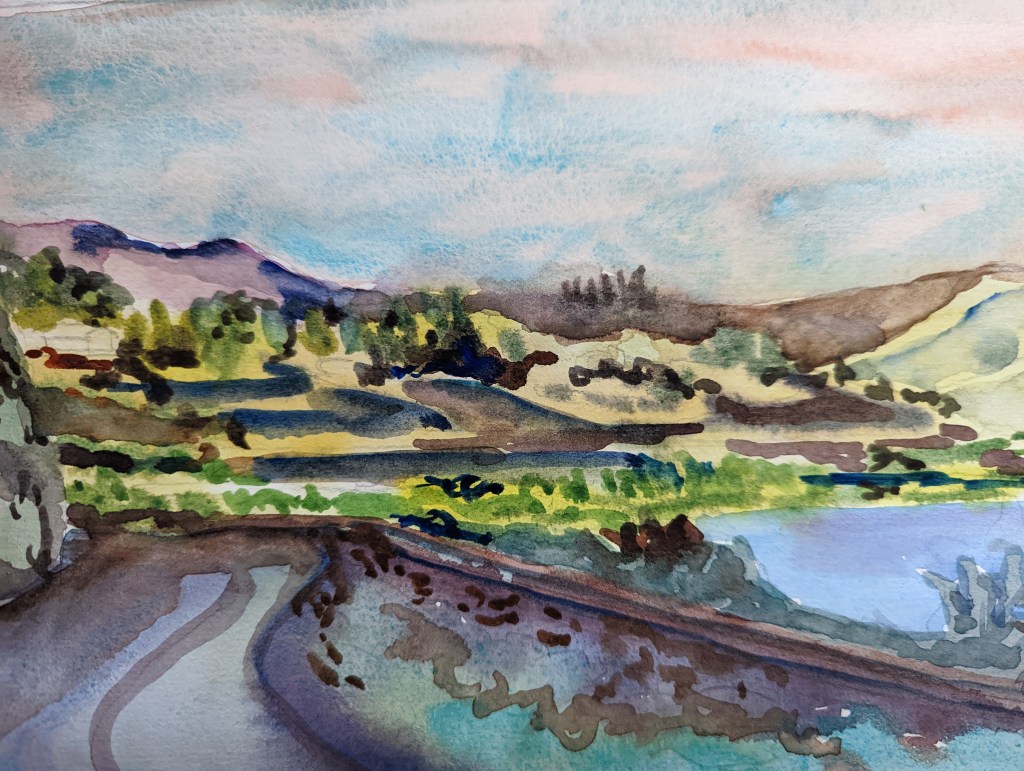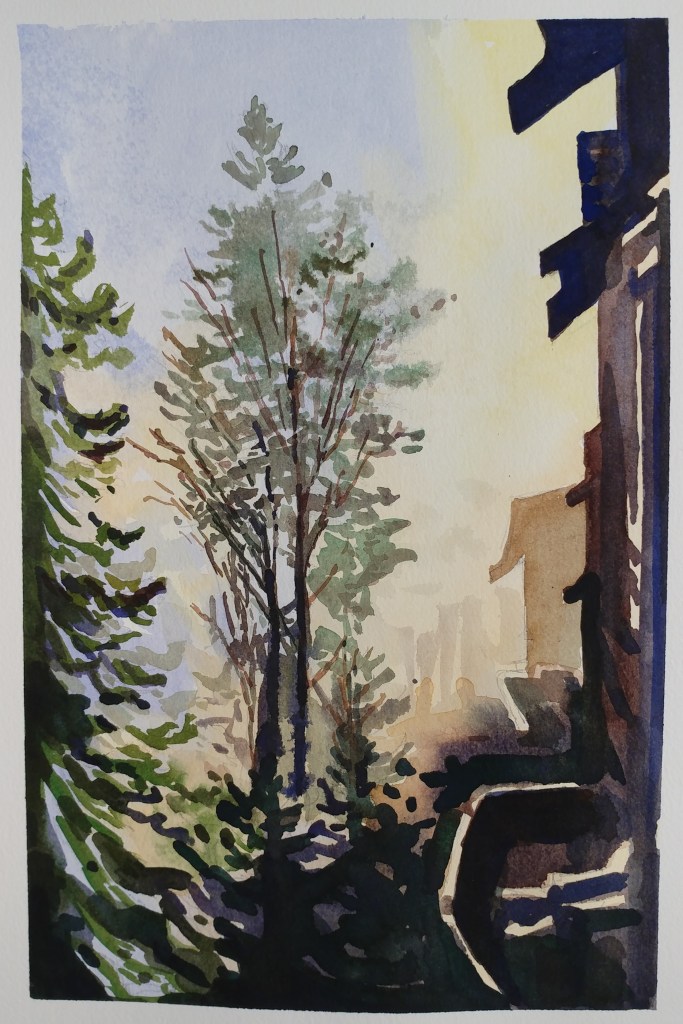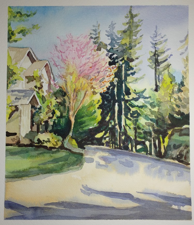 I stopped myself before I over-painted. It was my 3rd try. I had felt a compulsion to try this vantage point in watercolors. It worked a lot better when I stopped glazing over.