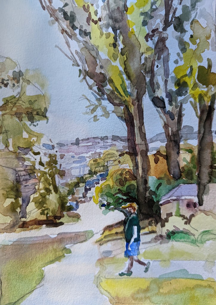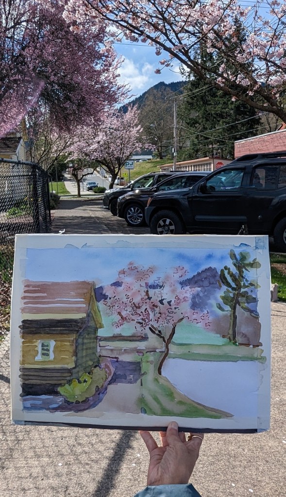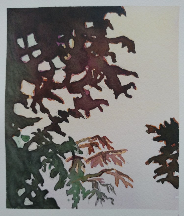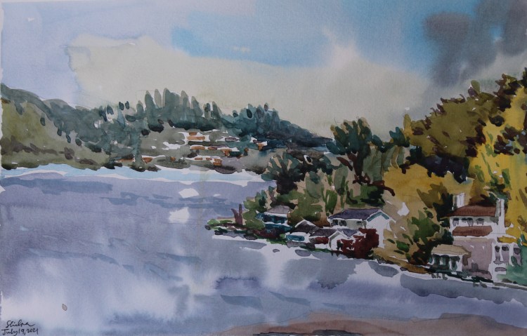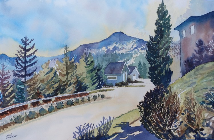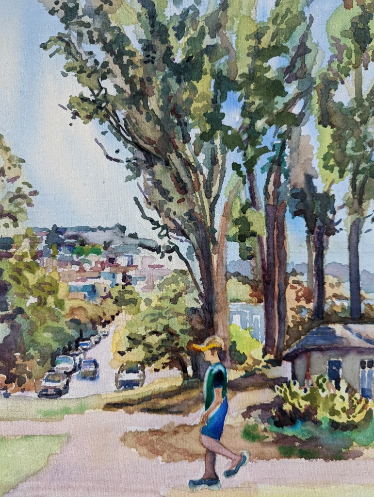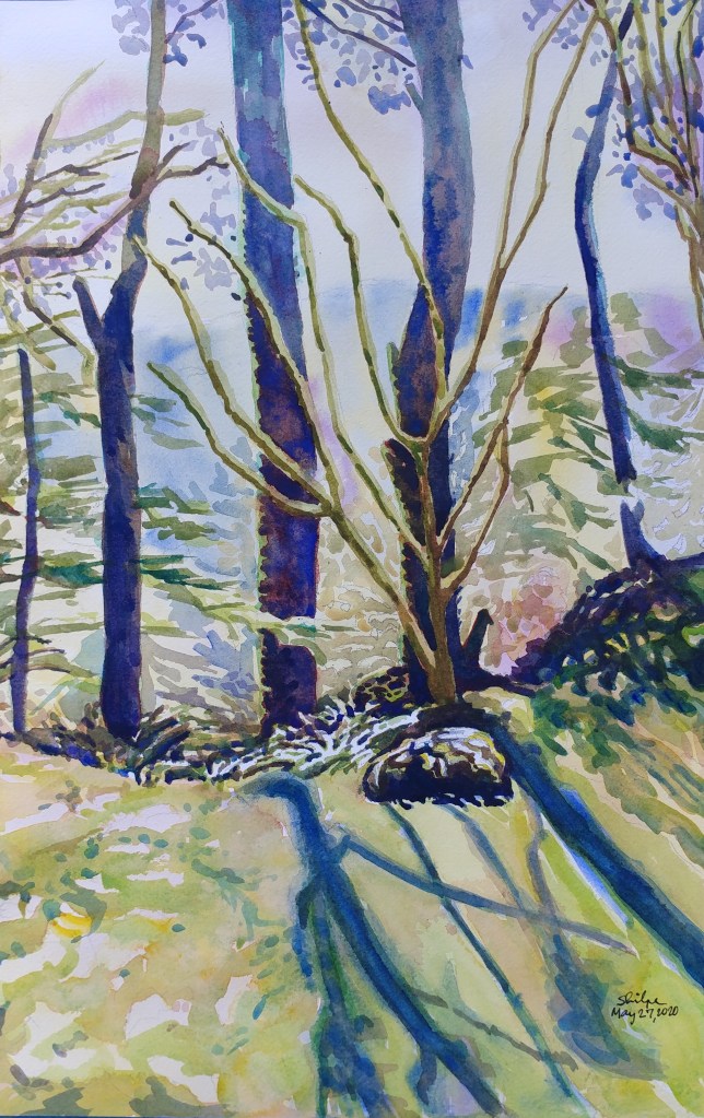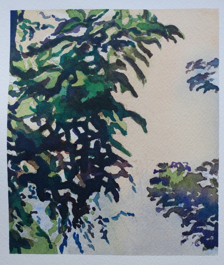 I stopped myself before I over-painted. It was my 3rd try. I had felt a compulsion to try this vantage point in watercolors. It worked a lot better when I stopped glazing over.