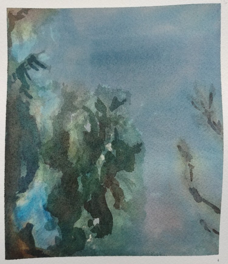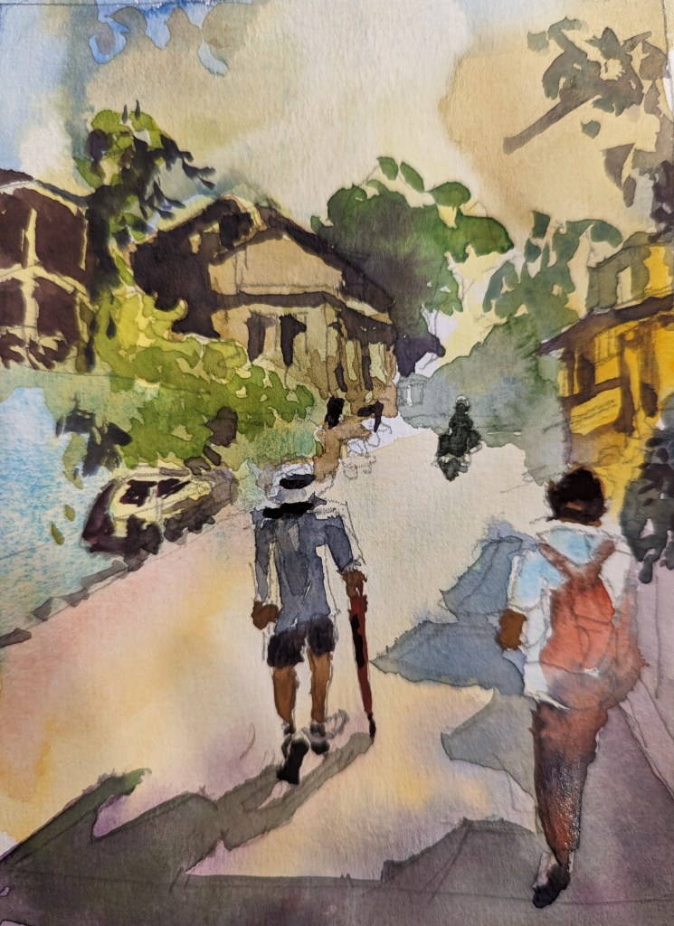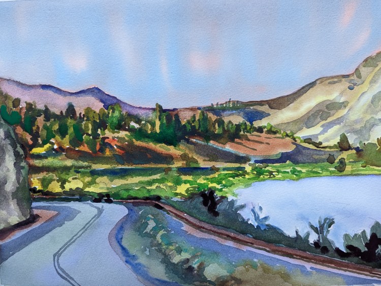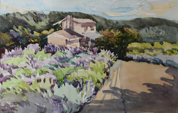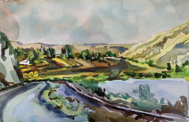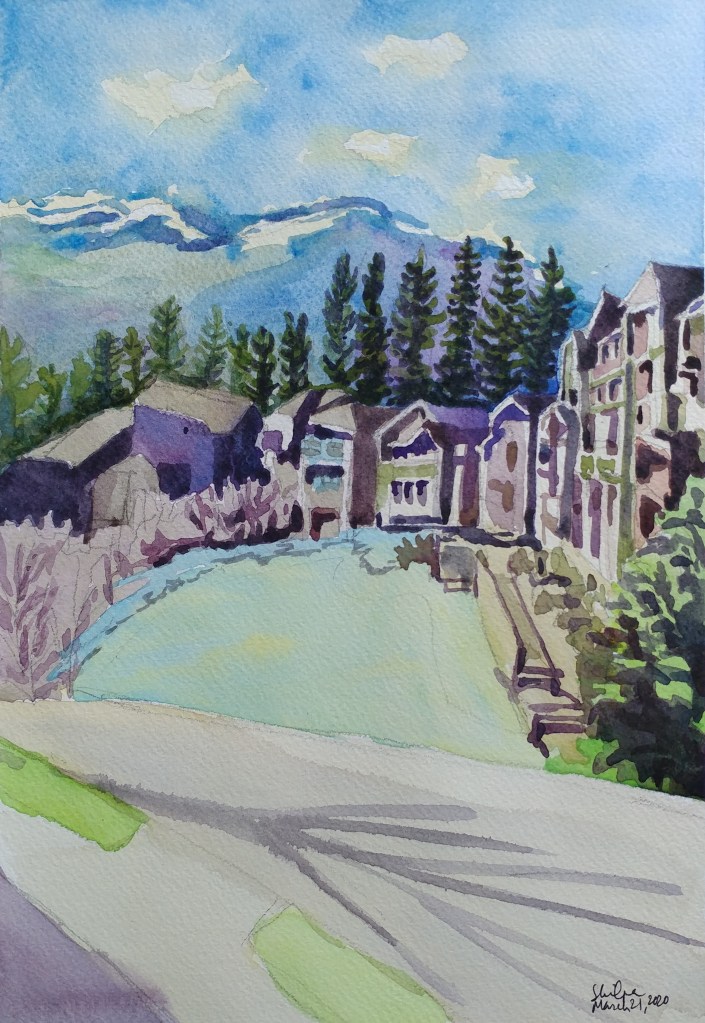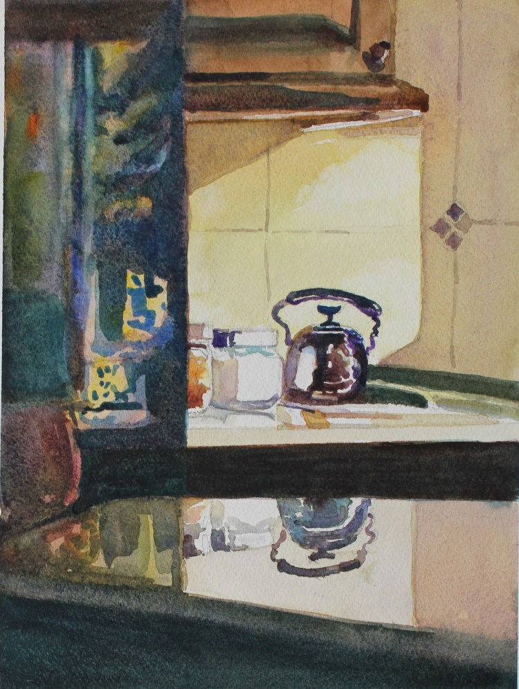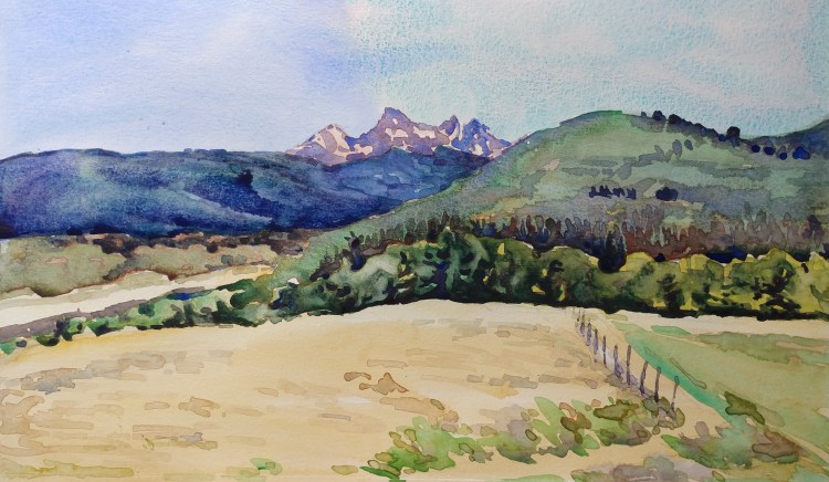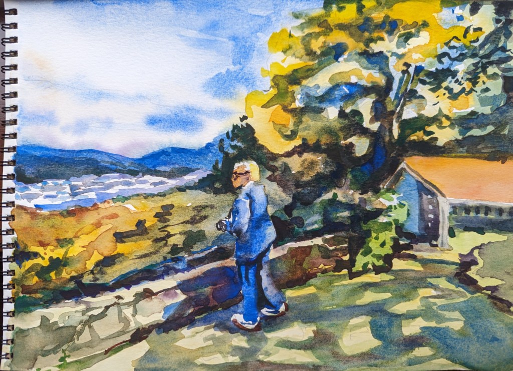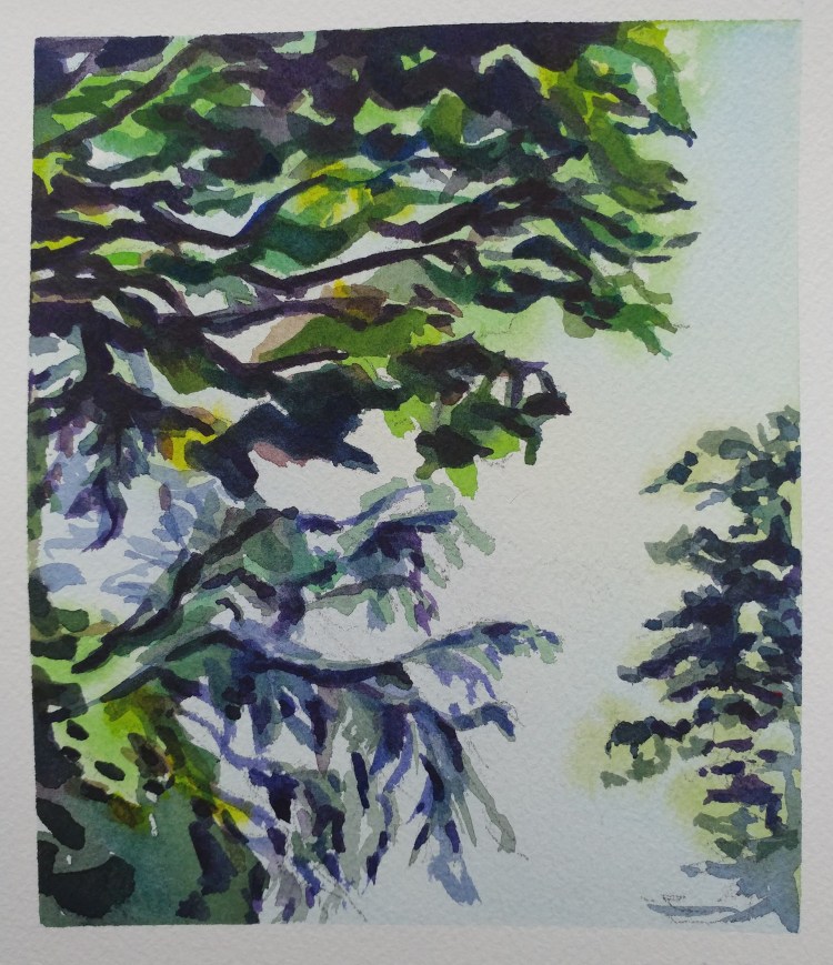 I stopped myself before I over-painted. It was my 3rd try. I had felt a compulsion to try this vantage point in watercolors. It worked a lot better when I stopped glazing over.