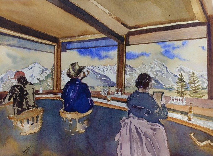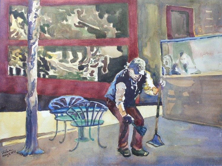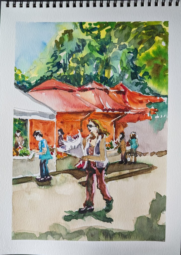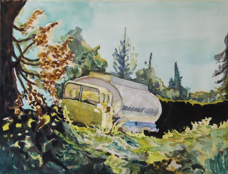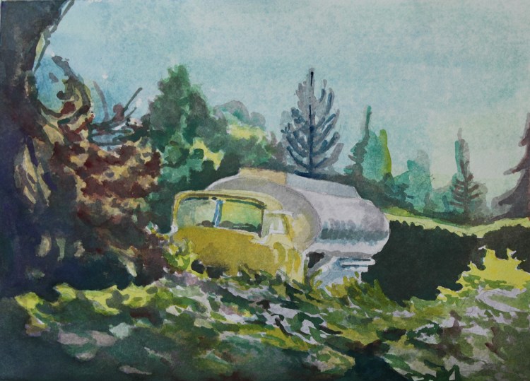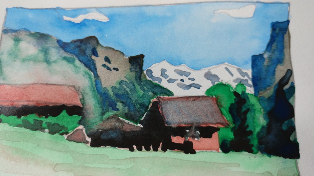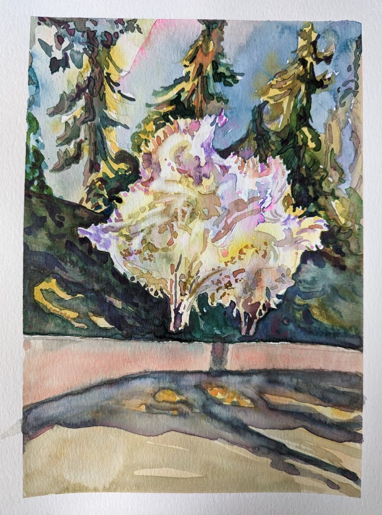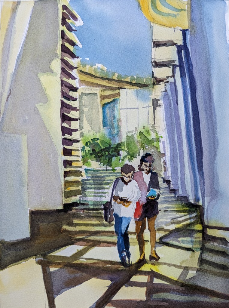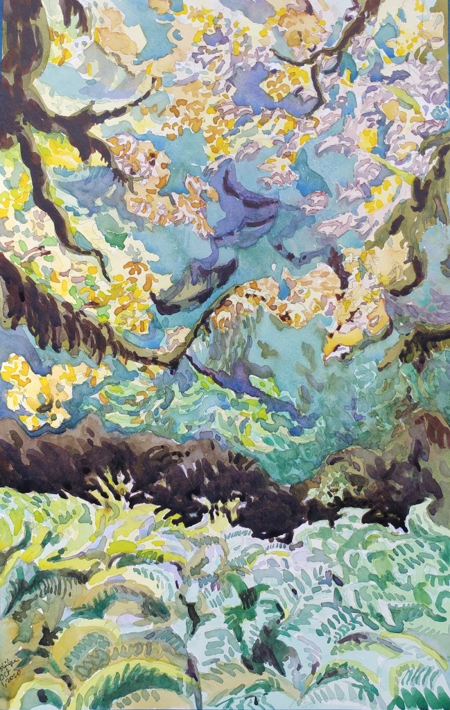I stopped myself before I over-painted. It was my 3rd try. I had felt a compulsion to try this vantage point in watercolors. It worked a lot better when I stopped glazing over.