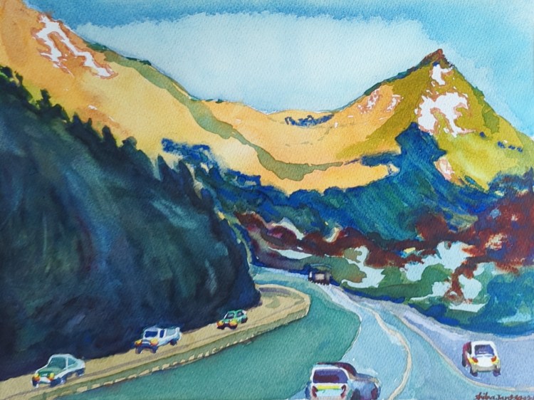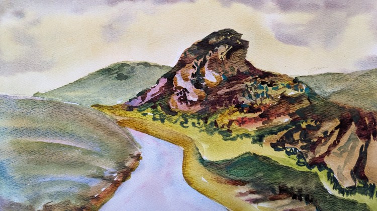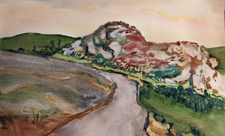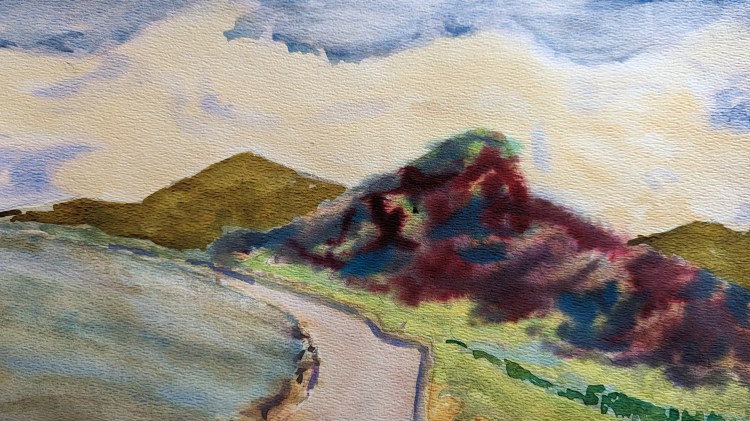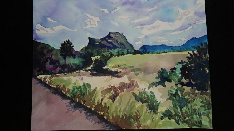 I used a subject of a distant hill to experiment with colors, technique and style. I really wanted to stick to using just the pure pigments. No layering; not too much mixing either.