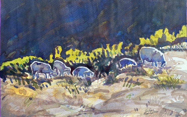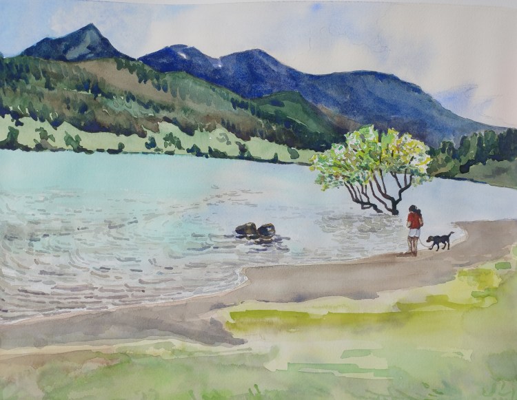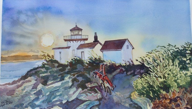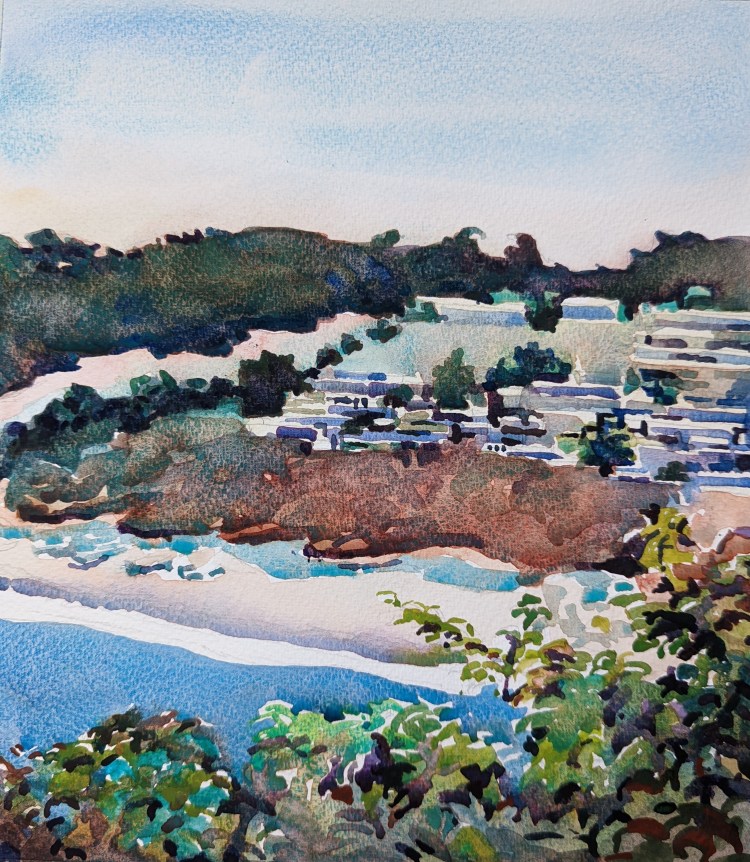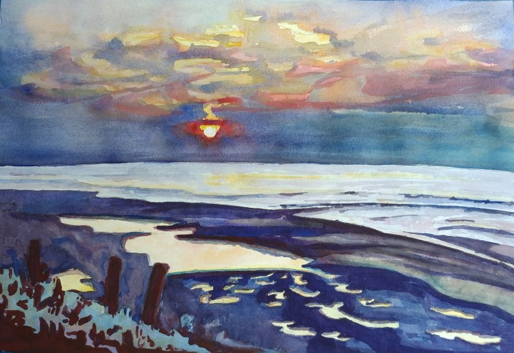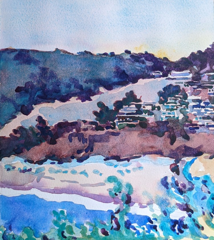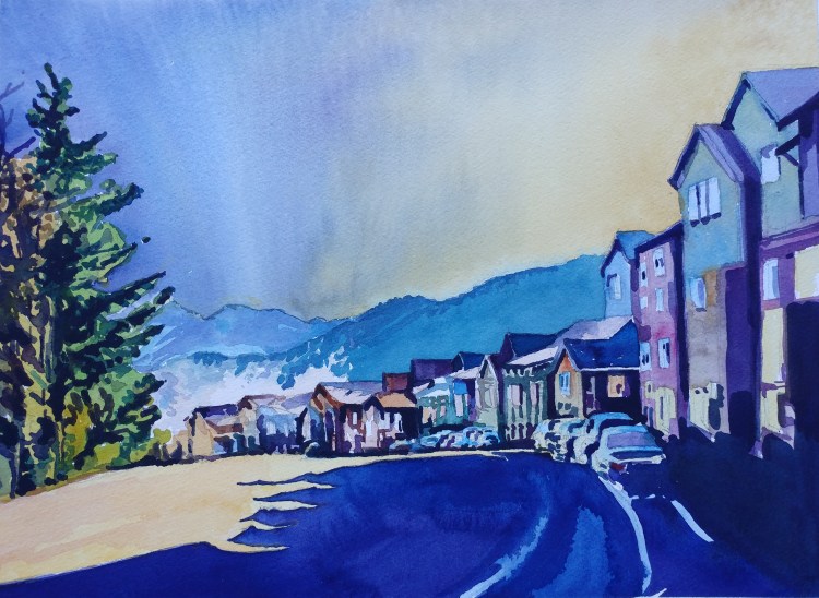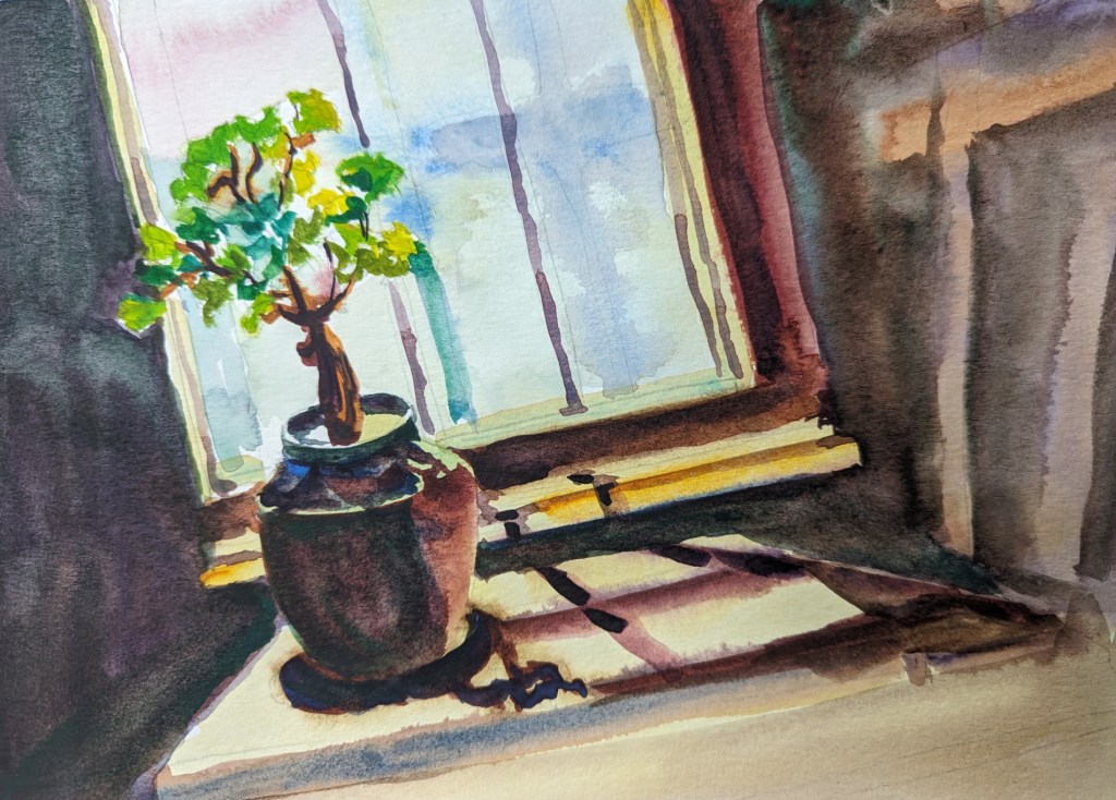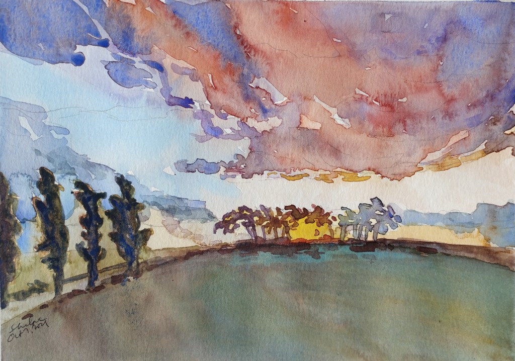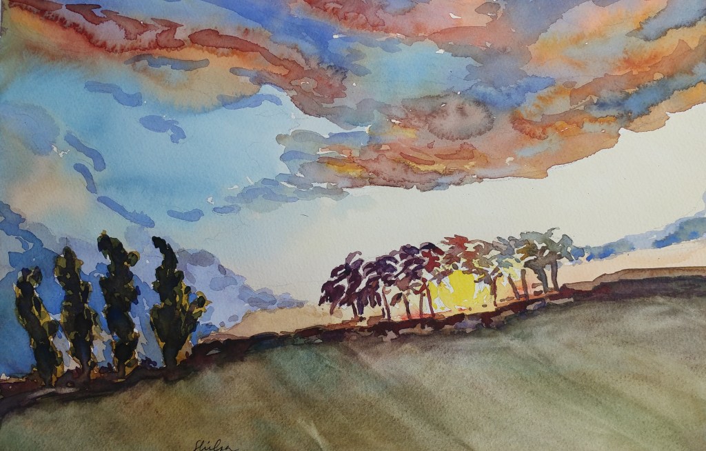 I had a leftover good quality watercolor paper strip. I knew I would use it one day. This subject was perfect for it. I made use of the long length and got to paint the light effect of the lingering sun before the summer sunset. The painting is just 13″ x 7″ on Arches.