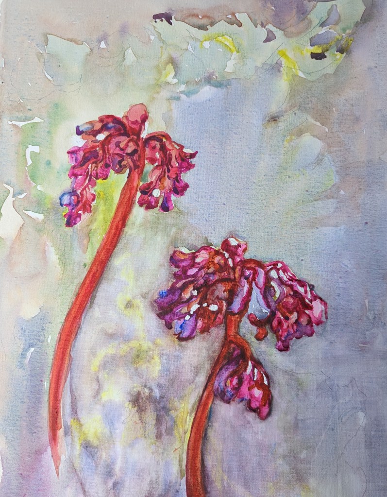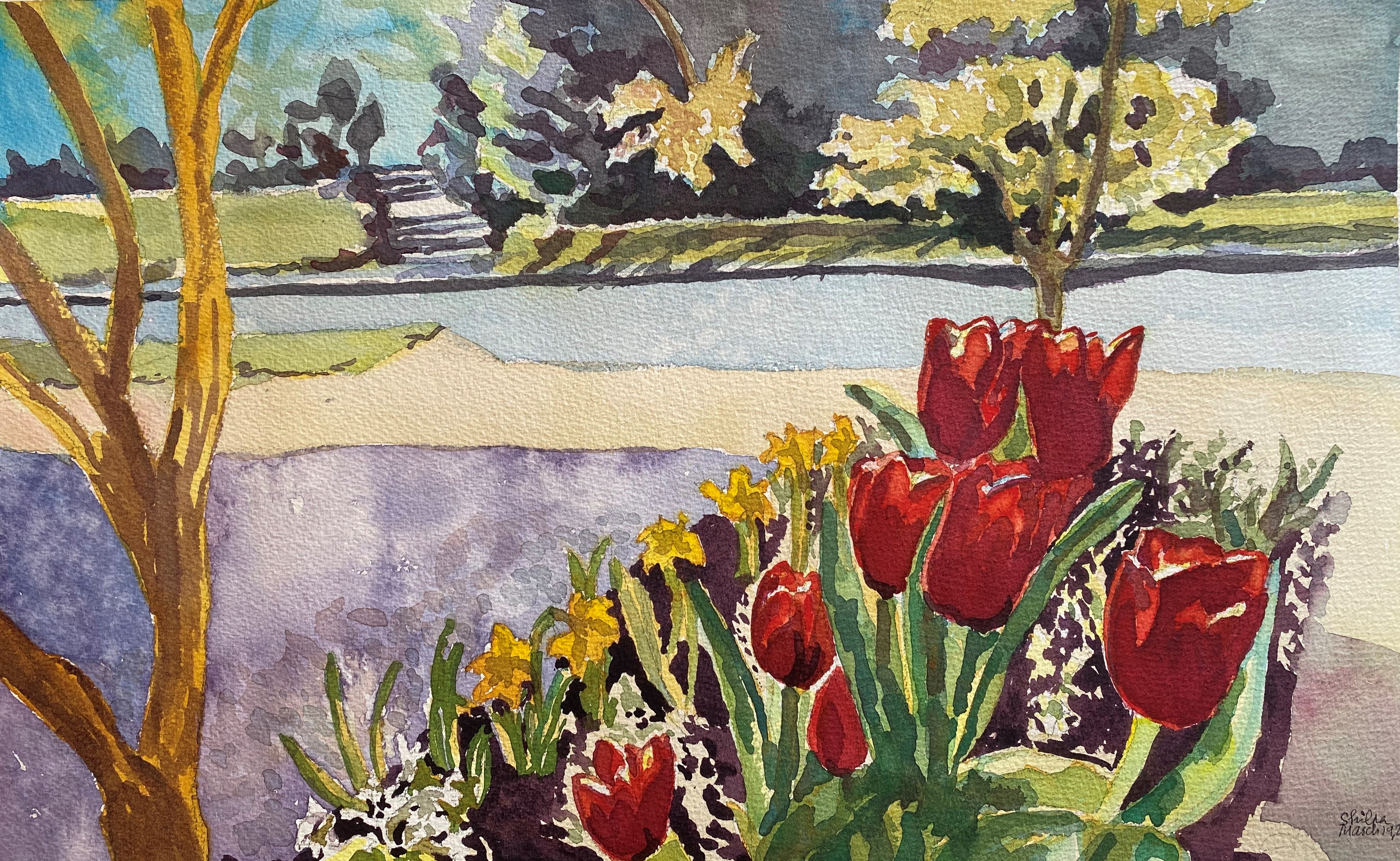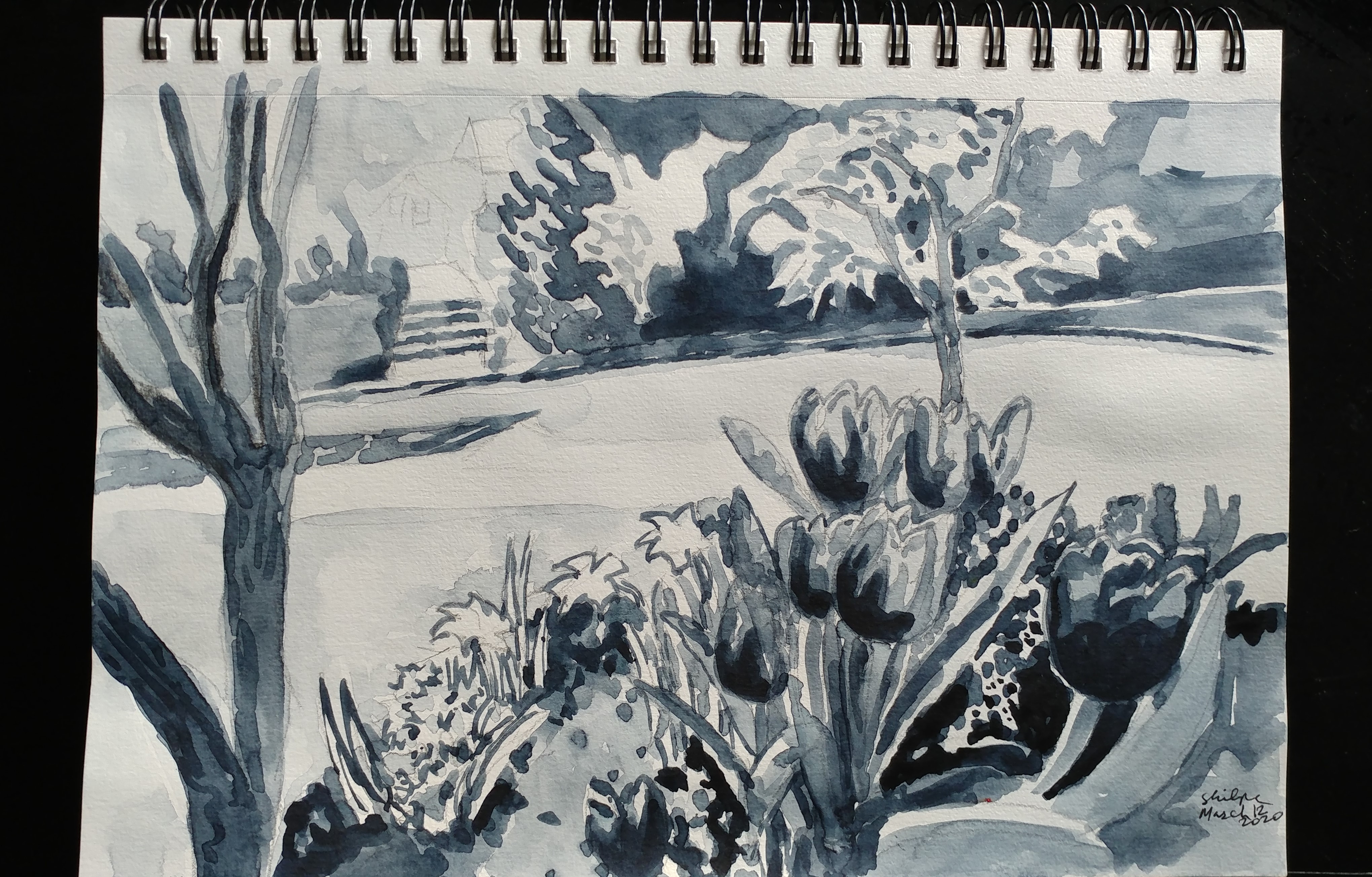When I think of painting flowers in watercolors, I can never look at them as single subject. It is more in a landscape form that I think of them. Tulips in the midst of their surrounding. How they contribute to the moment I experienced.