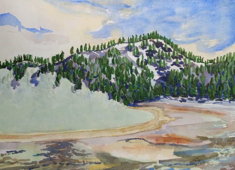 Geiser floor has amazing colors if an artist wants to paint that subject. However; how to manage painting of fumes? That was a puzzle I had to solve. I came up with a solution of underpainting with Lemon yellow. But I am sure there is a better way that I can learn.