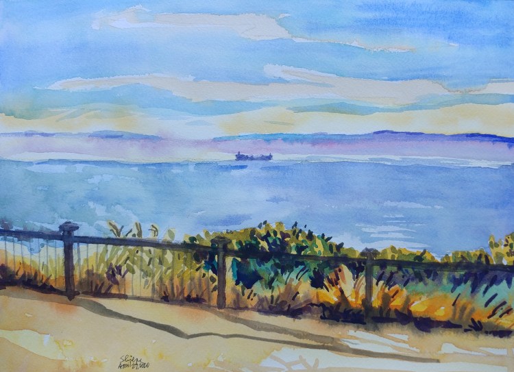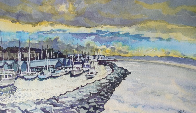 There was an attractive blue color band in the otherwise winter grey sky. It came about because of a sunbreak in the clouds. A challenge to paint for sure. Plus, I was going to paint the sailboats one day anyway.
