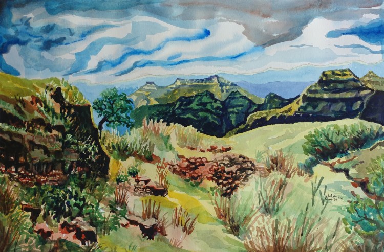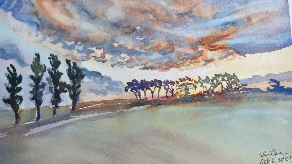 As the sun moves farther to the south, the shadows grow so long. I planned to capture this nuance. The above scene of a view from the hilltop added great drama to the sweeping shadows. Rather unintentional, but my washes for the sky too gave an extra touch to the drama I wanted to create 🙂