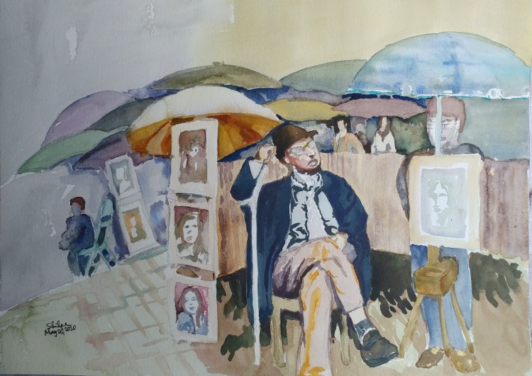 I had it all figured out. I was going to paint the artist I saw at Montmartre market in Paris. Many years passed. Now I was ready to paint and realized that the character I thought was an artist was really a customer who wanted get his portrait painted! Unfortunately this only proved a point that artists mostly live a life behind the limelight.