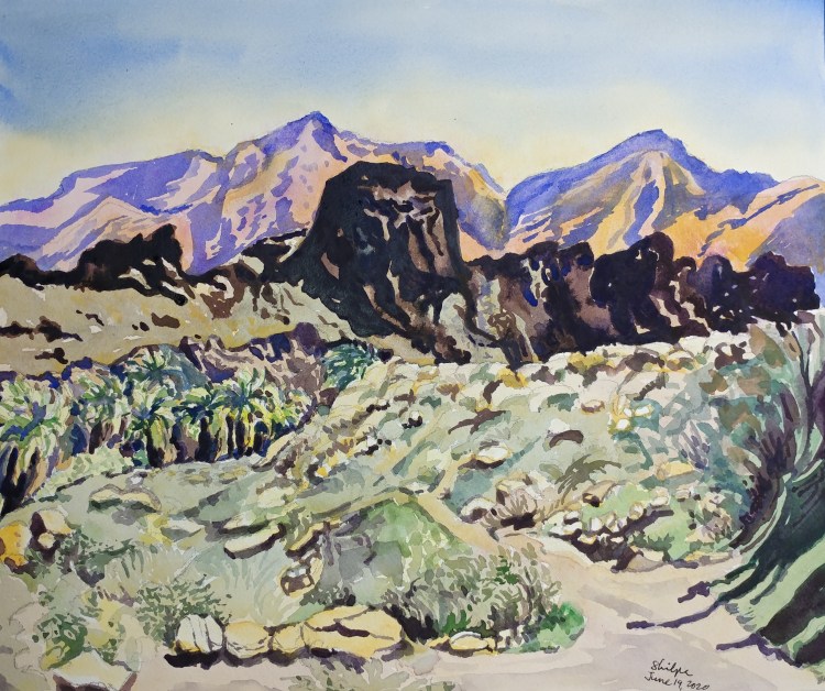 One smooth pink mountain; another one quite rugged and brown right next to it. Grass of unrecognizable colors, and fan palms growing in the canyon. The landscape is far from conventional at Palm Springs, CA. Its unsettling to grasp and to paint as well.