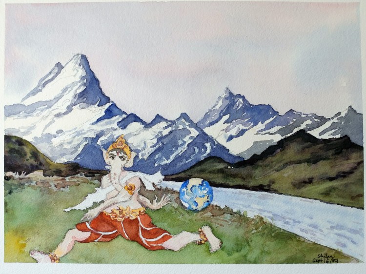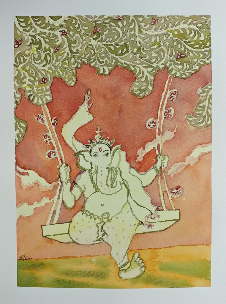 I recently learned about the dyes and painting styles of ancient India. There have been so many formal and many more informal traditional styles and I was truly enamored by them. In the modern age, I feel the techniques could be kept with the new subjects added. I tried something along those lines. Right on time on the day of the festival, may this Ganesha bring you what you are searching for!