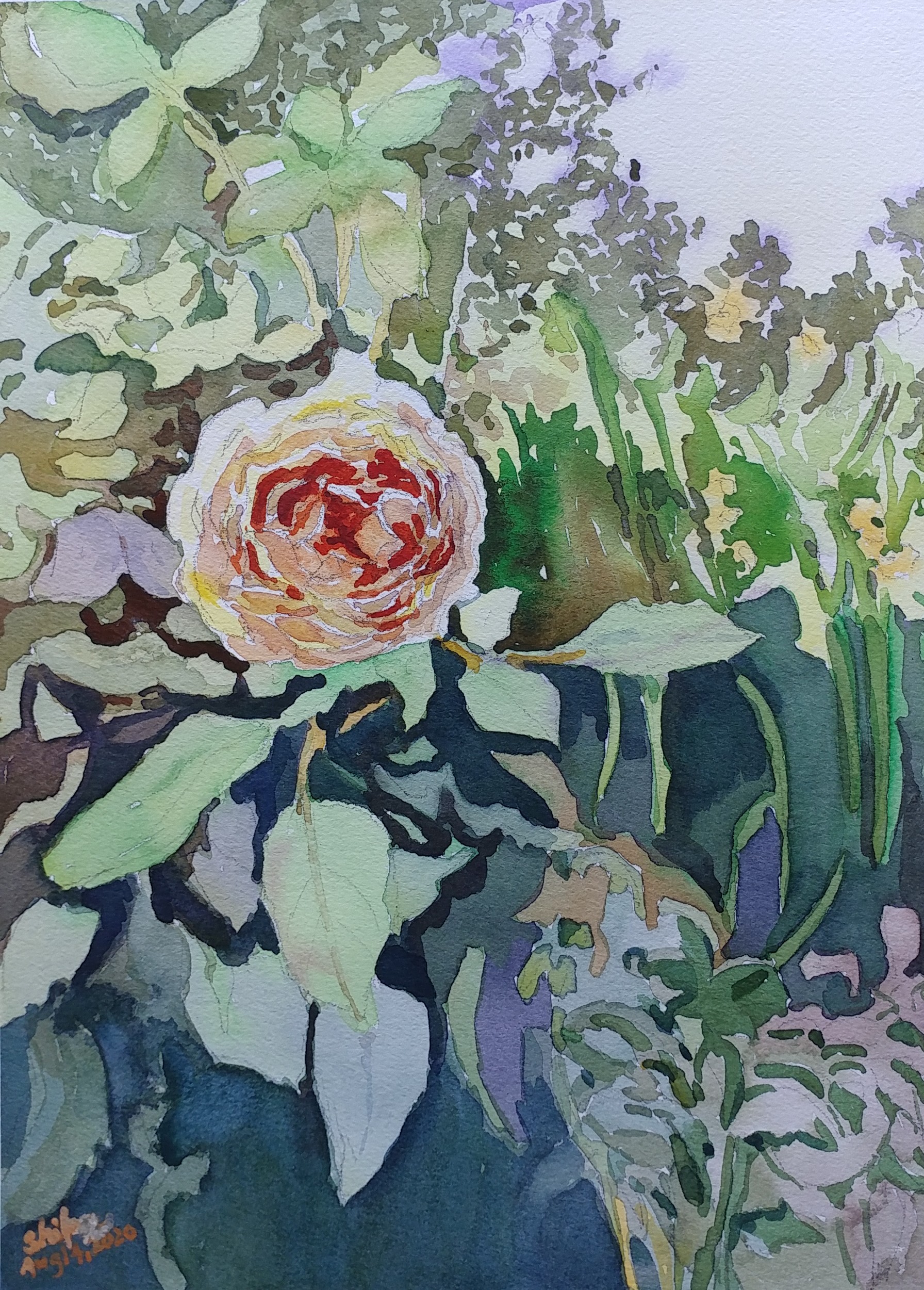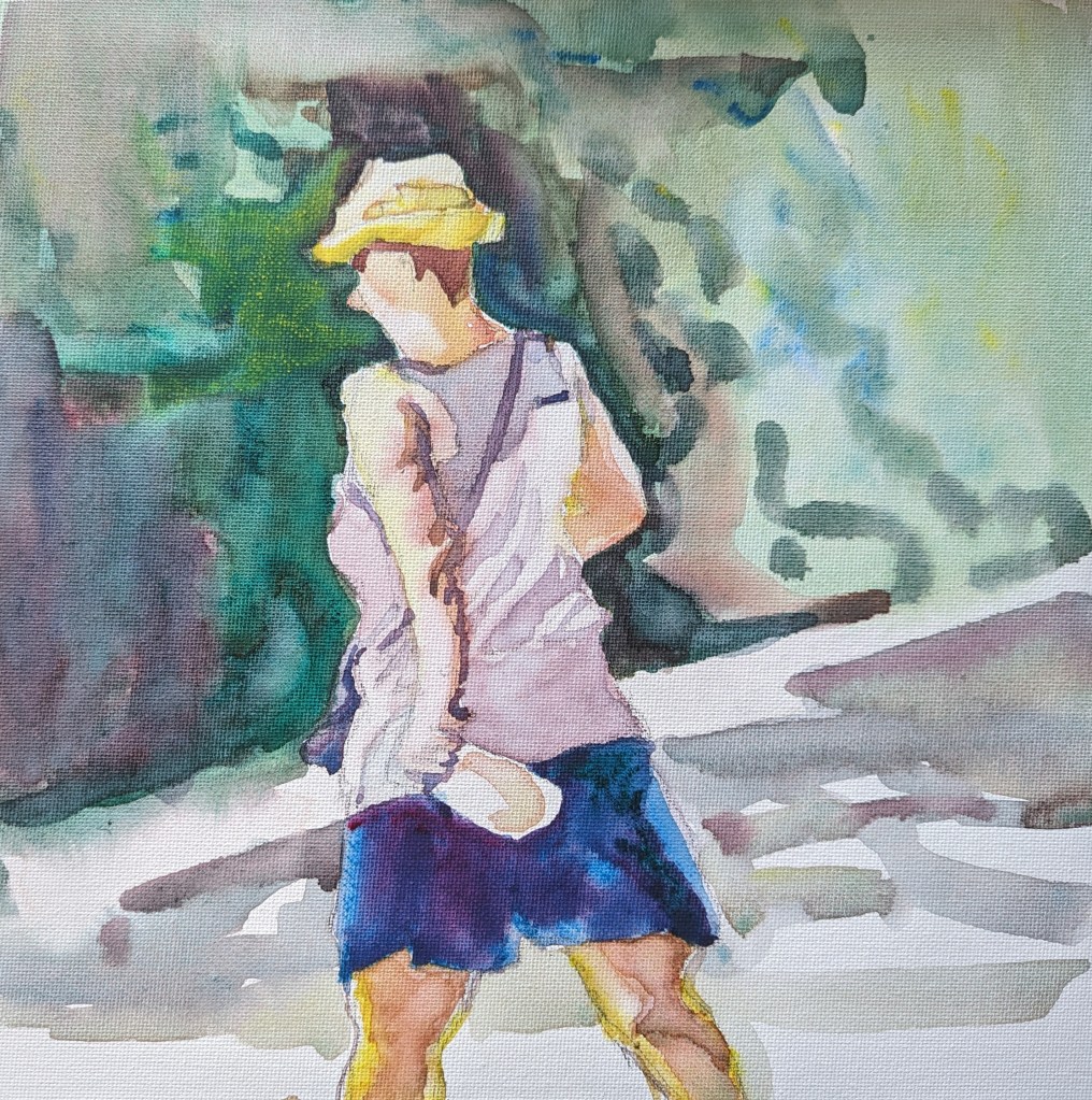 It was on a whim that I decided to paint this subject on a watercolor paper treated with Gesso. But I wish I had not. The color shine on gesso, so this method looks so inviting. But on gesso, I wrongly estimate the amount of pigment on the brush. Gesso does not absorb the pigment very well, so it stays on the surface and does not blend well. I am not going to be tempted again.