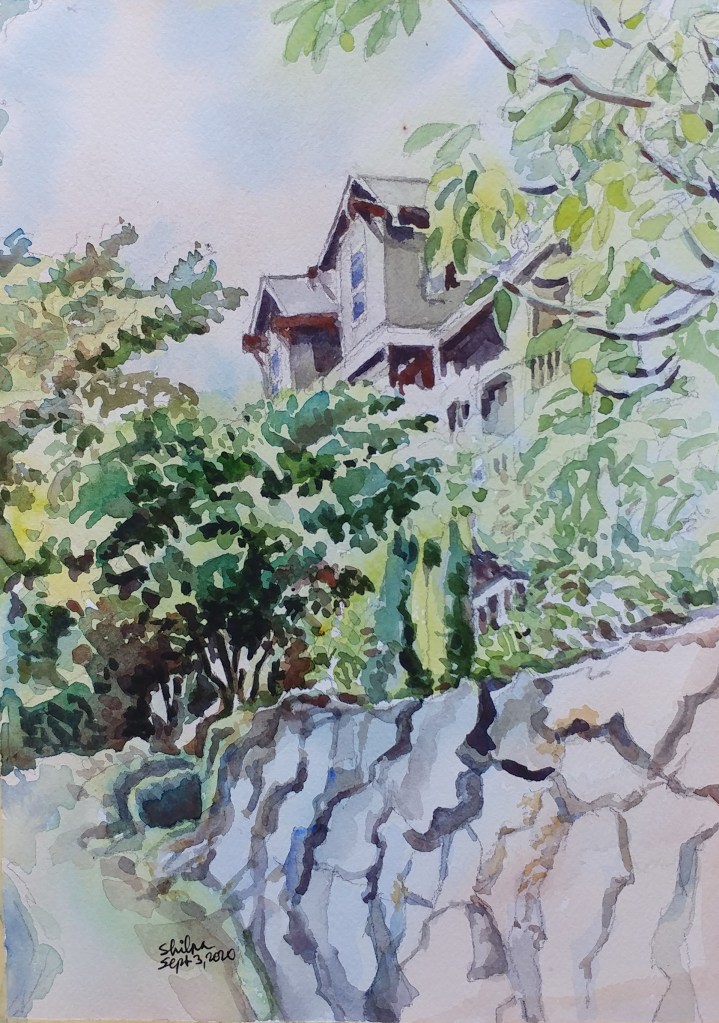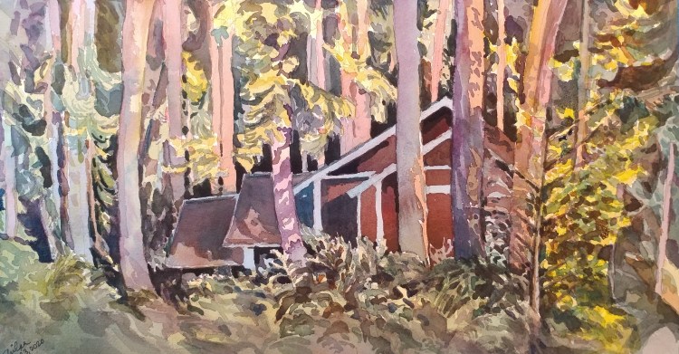 Angle of light is everything with watercolors. It is easy when the subject of the painting is well lit. But when the light falls from the gaps formed by tall trees it is not easy to determine which are the shaded areas and which are the lit ones; so the final result was a mystery with this painting. I took this subject as a challenge. It was a cabin that was tucked away.