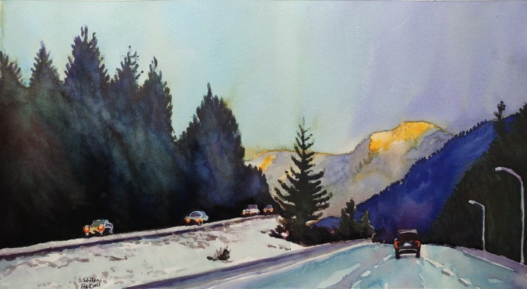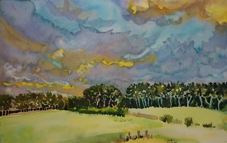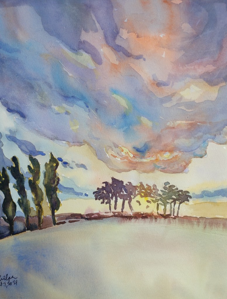 By far, I find that painting skies using watercolors is a project full of highest nuances. How much water, how quickly and how efficiently controlled; and not to mention pigments, mixing, and layering variables. I try everything because I am learning. I wanted to get the dynamic sky at sunset I had seen. I may take this up again to try a different technique.