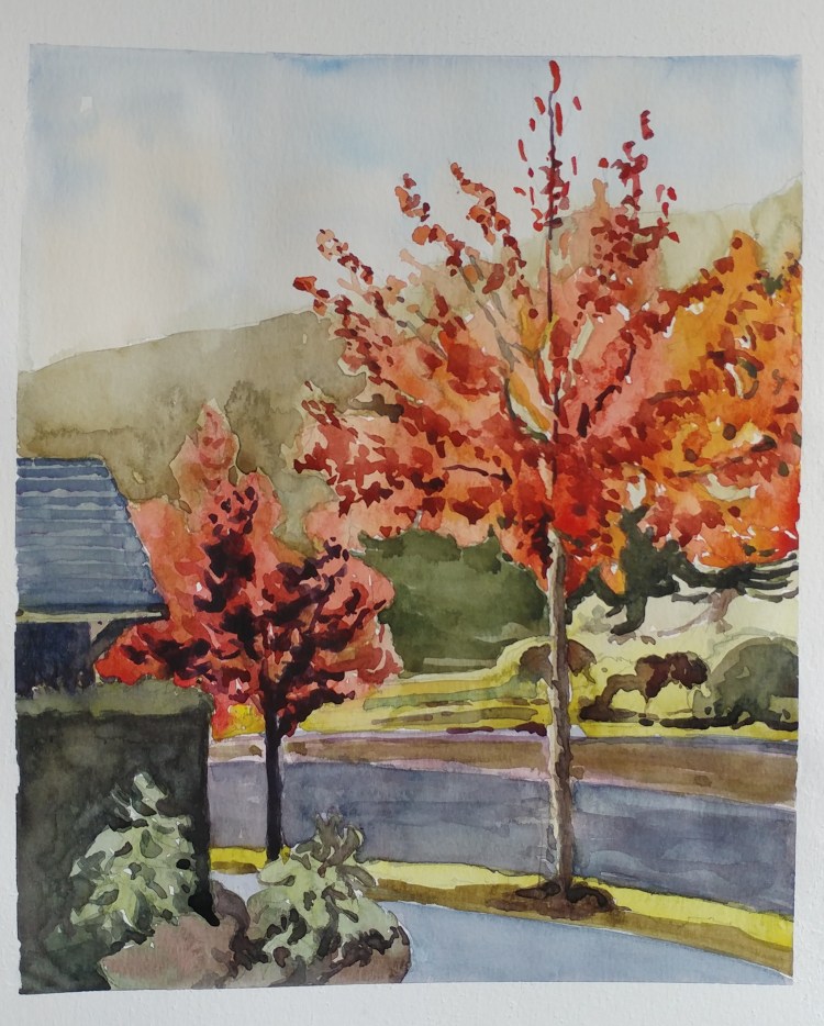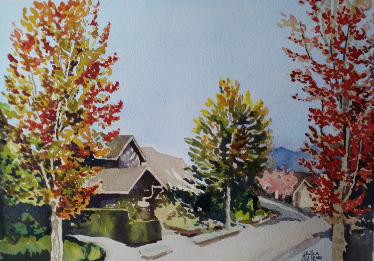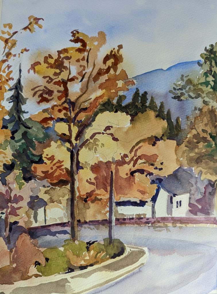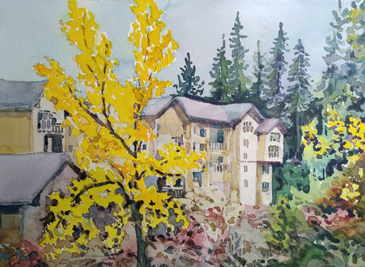 Yellow trees in fall are quite mesmerizing. They stop me in my track when I go for walks. For quick application, I used wet on wet, faster strokes, no waiting in between washes. Less finesse, but still gives an overall mood of the place and time.