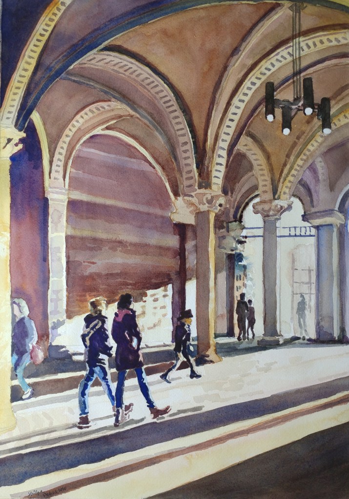 Historic buildings of architectural importance usually have such a scale and character that the sense of place of being there becomes imprinted in our memory. I wanted to paint this Rijks museum moment of outdoor light brightening up the structure inside.