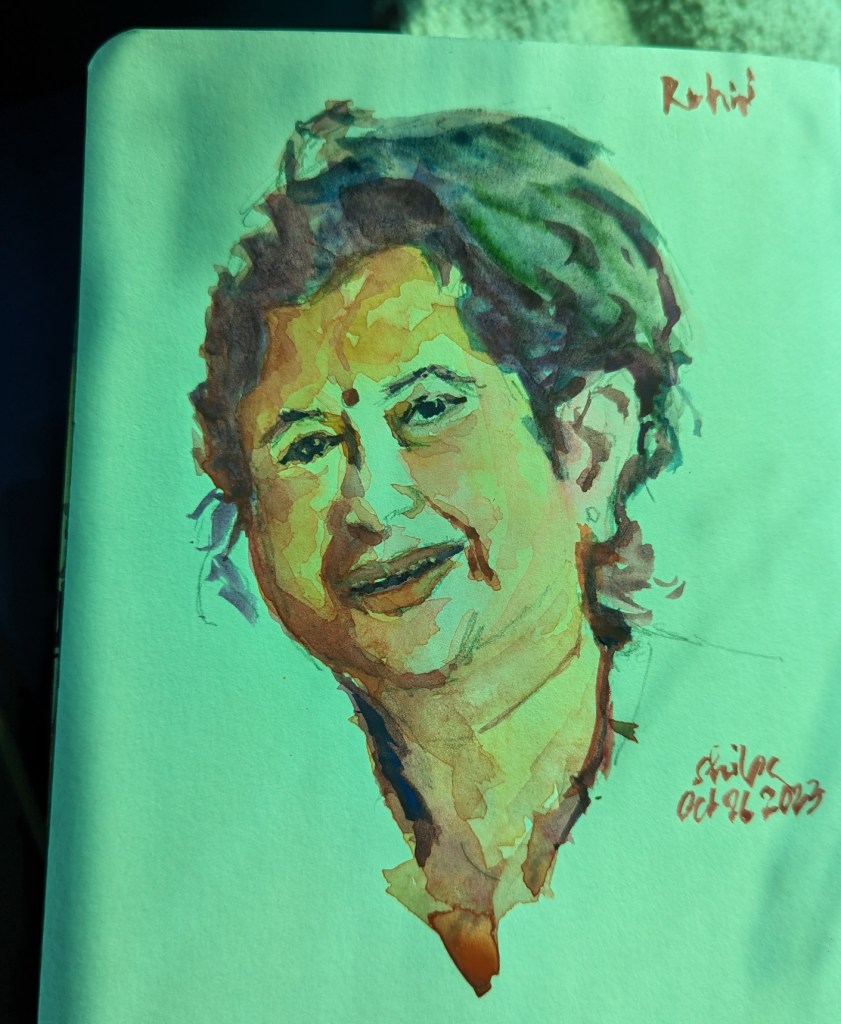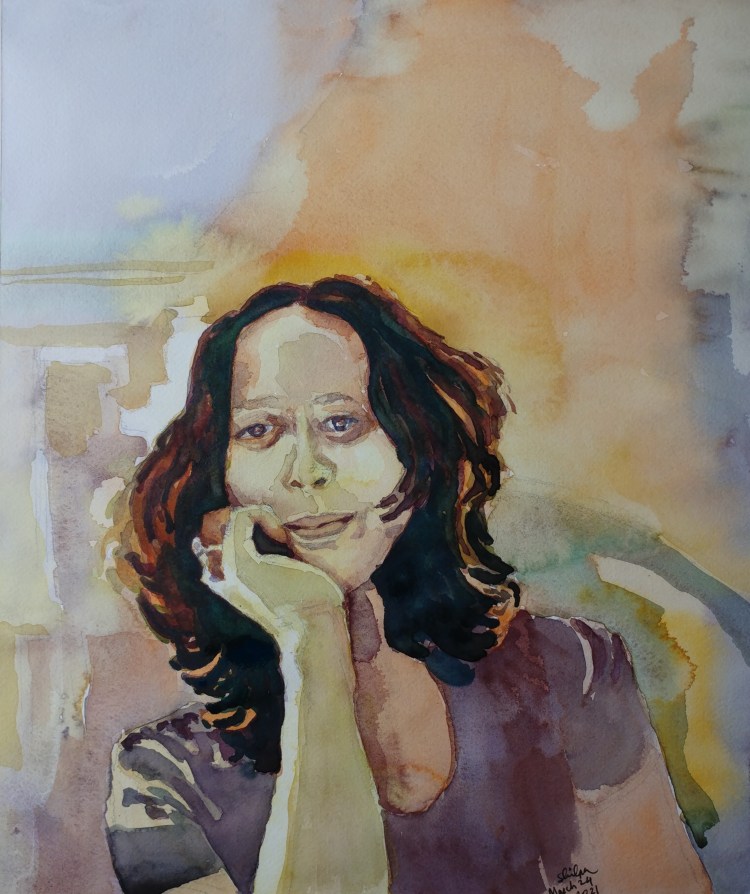 I tend to think a lot before I paint. Also, this pose location in the photo had a source of back light as well as some natural light. It required an interesting color scheme that made me think more before I painted. I tried to paint self portrait seriously for the first time. (And I forgive an overzealous painter in me who may have made myself look different :))