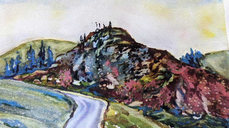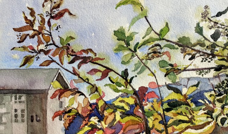 In the last 15 hours, two people suggested I paint a fall colors painting. I took it as a sign and stopped what I was already working on to paint this one this morning. It was a go with the flow (sort of literally with watercolors)! It has become a routine every fall, and now here’s this year’s.