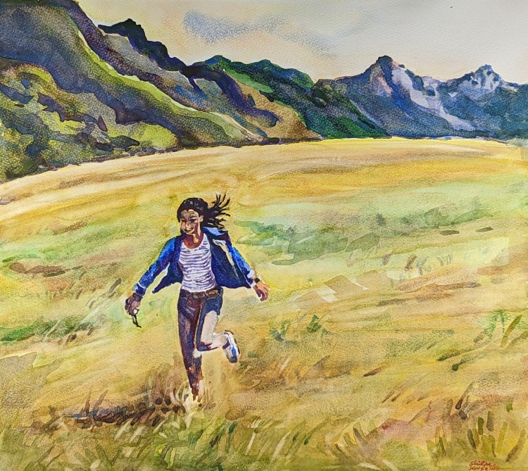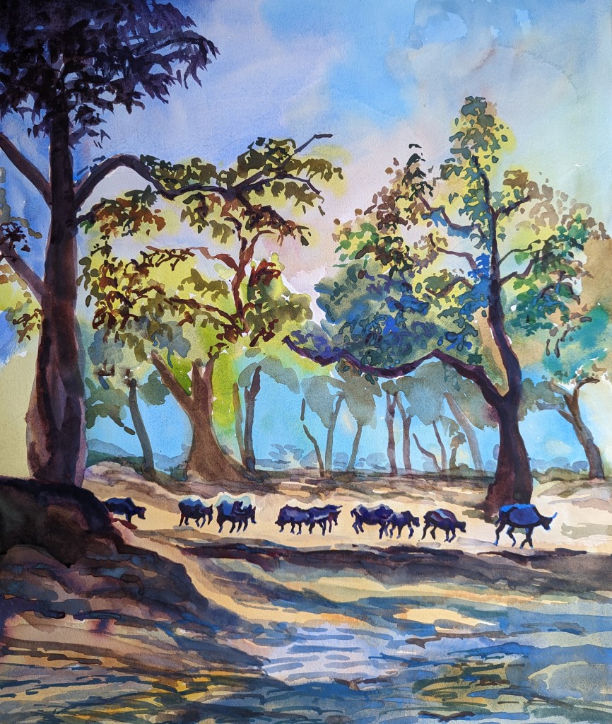 I had to carefully use the color application technique in this one. Didn’t want to show everything flat for the grass; but didn’t want to use too much texture either. All this while balancing on the depth in the landscape and at a larger scale of paper.