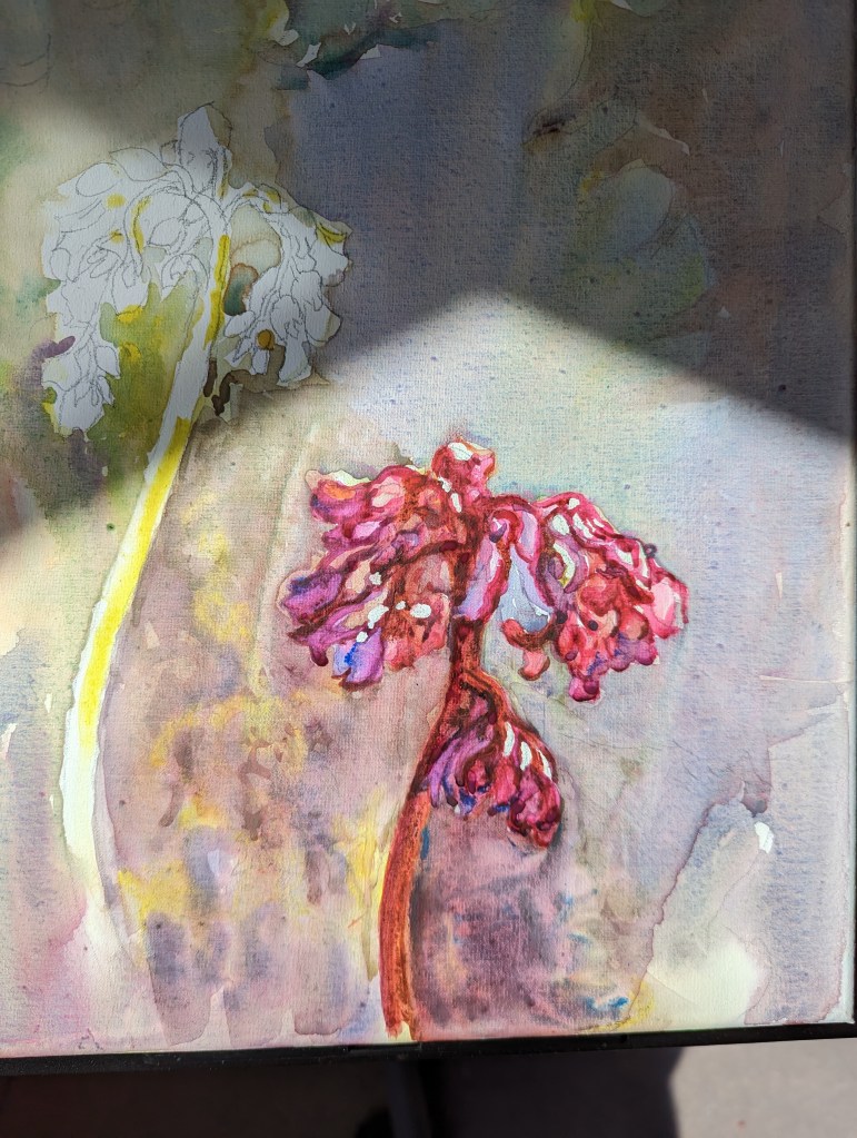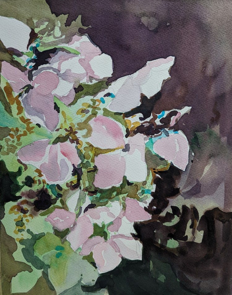 As I have progressed in my watercolor journey, I have vowed to keep it all clean, and focus only on fewer shapes. With this painting, I felt like I went back two steps. I kept painting each leaf. I am hoping not to do that. I started out with keeping the emphasis on the yellow pigment. But I loved the effect I got with Rose Madder in this!