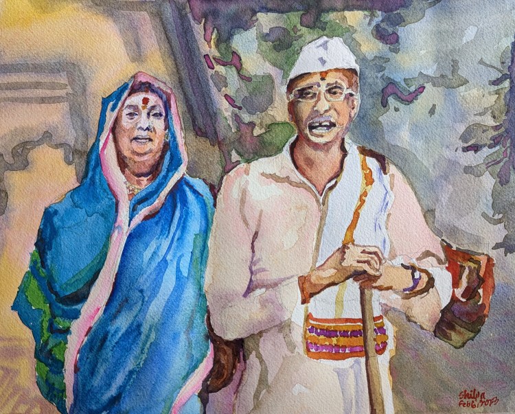 Well, this couple I met was doing that. They are the devotees. Even though they could afford the supplies, they asked for bhiksha (donation, alms). They were headed to a place of worship called Alandi. They are the simple people from Maharashtra I adore. I couldn’t help but pour my emotions into this painting. Hope you like it as much as I do.