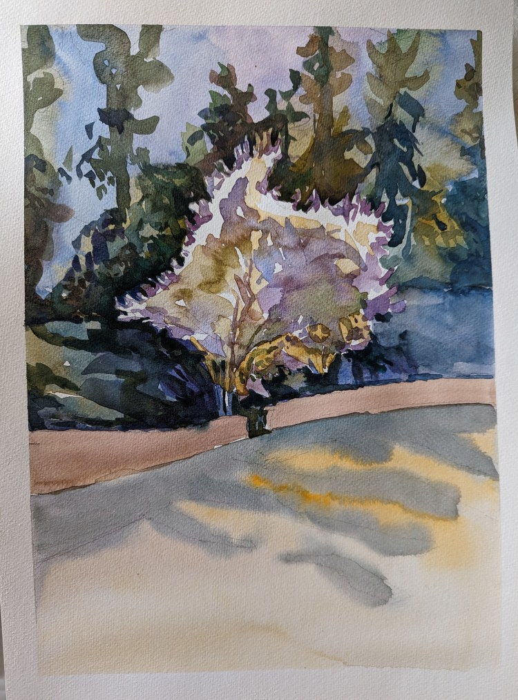 Blue and purple flowers when located in shade or under cloudy skies have been difficult to paint for me. I remember once spending a lot of time on purple irises without a desired outcome. When I saw a shrub totally full of purple flowers last week, I decided to give it a try again. I like this one though.