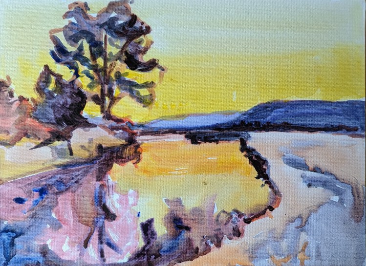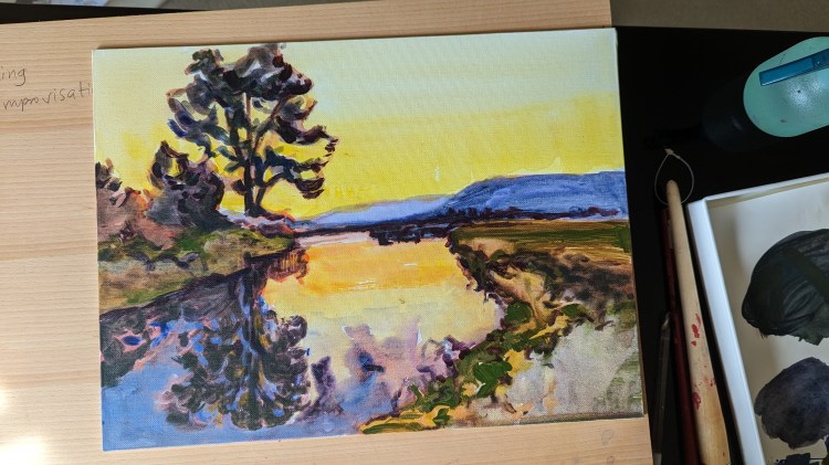 I painted and I liked how the colors looked in it. However, I was not sure if the viewer was able to enjoy the trees on the hill very well. So I painted another study – Study 2.