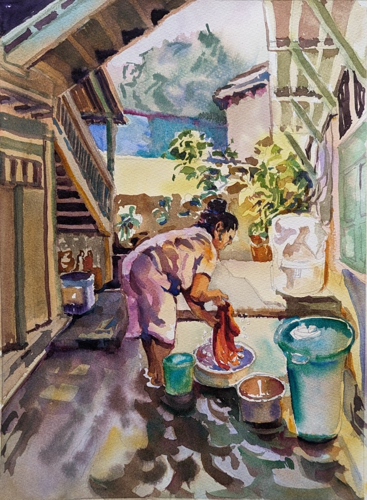 I chose this subject because it offered me to paint with a variety of colors, and I could present a sense of being in a narrow old space surrounded by wooden structures. The painting became all the more unique when combined with a moment that captures the focus of a domestic worker.